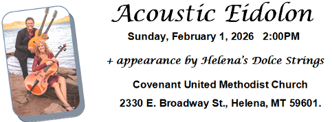 A superb musical event with brilliant instrumentality of some of the most captivating music…performed from Europe, Australia, across the USA….& now to be heard in Helena, MT Performed by Joe & Hannah – An unusual instrumentation including the one-of-a-kind double neck guitjo (Joe’s own design) with classically-trained cellist Hannah |