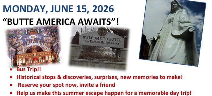 Mark your Calendar - Meet the Mayflower Tour Rep. Unveiling 2027 BIG TRIPS Apr. 29th, 2pm - Helena’s Double Tree Inn, Downtown Upper conf. rm. Invite a friend! Coffee/Treats/Door Prizes |